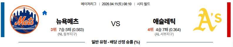 홈즈의 투구는 위력적이다. 애슬레틱스 타선 상대로 나름 승부가 될듯. 관건은 메츠 타선이 얼마나 진을 공략할수 있느냐지만 가능성은 그다지 높지 않은 편. 결국 불펜이 관건인데 애슬레틱스는 2경기 연속 승리조를 기대할수 없는 팀이기도 하고 메츠는 어쨌든 불펜 소모도를 아꼈다. 메츠의 승리 가능성이 조금 더 높다.