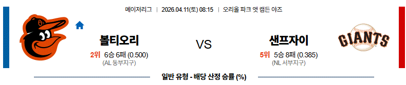 최근 샌프란시스코의 타격은 상위 타선에 올인이 된 모습이다. 반면 볼티모어는 한번 터지면 무섭지만 그렇지 않으면 부진한 편. 양 팀의 타격 스타일을 고려한다면 이번 경기는 은근히 투수전 가능성이 높은데 클러치 상황에서의 불펜 운용은 현재로선 볼티모어가 더 좋고 이 점이 승부를 가를 것이다. 볼티모어의 승리 가능성이 조금 더 높다.