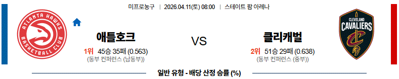 애틀랜타는 직전 맞대결 패배 이후 하루 휴식 뒤 홈으로 장소를 옮겨 펼쳐지는 리턴매치에서 반등 동기가 분명한 상황이다. 특히, 직전 경기에서 3쿼터 수비 붕괴로 흐름을 내준 점이 뚜렷했던 만큼 홈에서는 수비 집중력 회복이 핵심이다. 반면, 클리블랜드는 4연승 상승세지만 주요 자원들의 복귀 일정이 걸려 있어 정상 전력 운영이 쉽지 않을 가능성이 존재한다. 또한, 애틀랜타가 홈에서는 안정적인 공격 전개를 이어가고 있는 점과 리턴매치 특성상 흐름 변화 가능성을 고려하면 애틀랜타 승리가 예상된다.