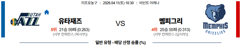 멤피스는 직전경기(4/9) 원정에서 덴버 상대로 119-136 패배를 기록했으며 연속경기 일정이였던 이전경기(4/7) 홈에서 클리블랜드 상대로 126-142 패배를 기록했다. 시카고 상대로 5연패에서 벗어나는 승리가 나왔지만 연승 없이 다시금 6연패를 기록했으며 리바운드 38-52, 3점슛 19-14, 턴오버 6-12의 결과. 세드릭 코워드(27득점)가 공격을 이끌며 전반에는 3점슛 13개를 성공시키는 높은 외곽 효율로 리드를 잡는 흐름을 만들었지만 3쿼터 들어 슛 성공률이 급격히 떨어지며 공격 흐름이 끊겼고 수비에서도 상대 런을 전혀 제어하지 못하면서 경기 주도권을 완전히 내줬던 경기. 후반 집중력 차이가 크게 드러났고 결국 격차를 좁히지 못한 채 패배로 이어졌으며 최근 20경기 18패 흐름으로 전체적인 경기력 하락세가 뚜렷하게 나타나는 상황이다. 규시즌 원정경기에서는 9연패 흐름속에 11승28패 성적.