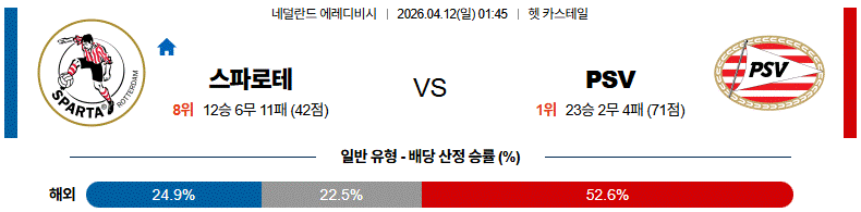 스파로테 vs PSV 경기 분석에서는 전력과 공격 생산성에서 크게 앞서는 PSV가 우세한 경기입니다.
