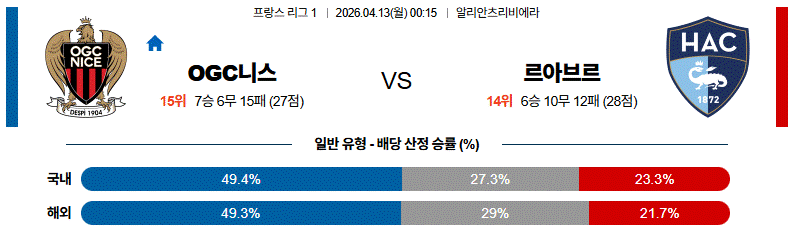 르아브르는 수비 숫자를 늘리며 버티기에 집중하겠지만, 홈에서 경기 운영 완성도가 높은 OGC니스가 전체적인 주도권을 잡을 가능성이 큽니다.
