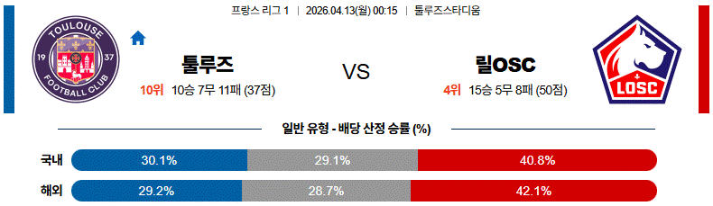 툴루즈는 홈에서 적극적으로 나설 수 있지만, 수비 전환의 불안이 릴OSC의 침투와 전개에 흔들릴 가능성이 있습니다.