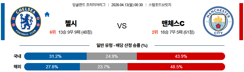 첼시는 홈에서 빠른 템포로 승부를 걸겠지만, 중원 장악력과 전술 완성도에서는 맨체스C가 앞서는 흐름입니다.