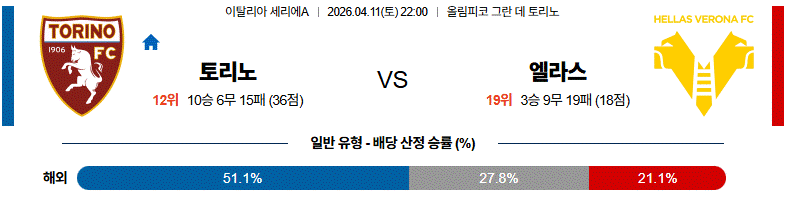 이번 세리에A 경기는 수비 밸런스가 좋은 토리노와 실리적인 운영을 펼치는 엘라스 베로나의 맞대결입니다.