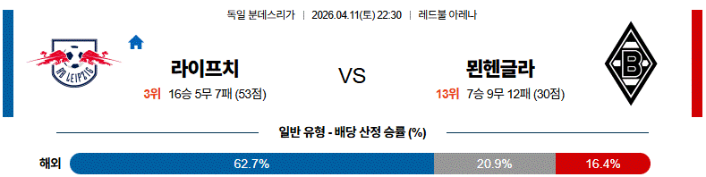 라이프치히는 홈 경기에서 높은 승률과 득점력을 바탕으로 경기 주도권을 잡을 가능성이 높으며, 묀헨글라드바흐는 역습으로 대응할 전망입니다.
