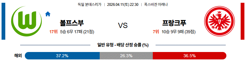 이번 분데스리가 경기는 홈에서 공격적인 흐름을 가져가는 볼프스부르크와 역습과 득점력에서 강점을 보이는 프랑크푸르트의 맞대결입니다.