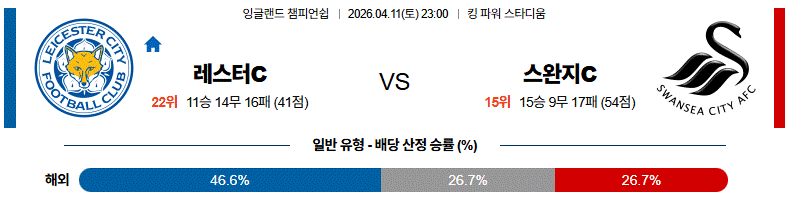 스완지시티가 전개 과정에서 볼을 만질 시간은 있겠지만, 수비 전환과 공간 정리에서 흔들리는 순간 레스터시티의 침투 타이밍이 훨씬 더 날카롭게 꽂힐 수 있다.