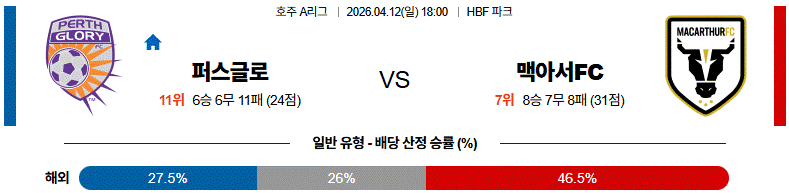 ⚠️ 전술 구조와 원정 조건, 그리고 세트피스 위협까지 함께 보면 이 경기는 퍼스 글로리가 홈에서 승부를 가져올 가능성이 더 높다!