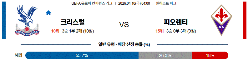 크리스털은 홈에서 강한 압박과 활동량을 기반으로 초반부터 흐름을 끌어올릴 가능성이 높으며, 피오렌티는 중원 장악과 점유율을 통해 경기 템포를 조절하려 할 것입니다.
