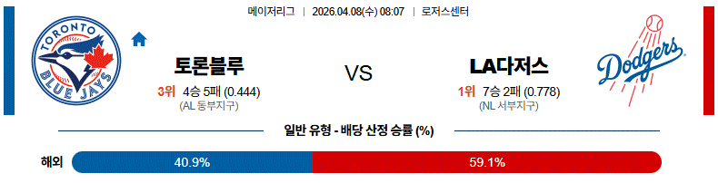 - 다저스가 중후반 장타와 연속 안타로 흐름을 잡을 가능성이 높습니다. 토론토도 맞불은 가능하지만 전체 득점 기대치는 원정팀이 더 높습니다.