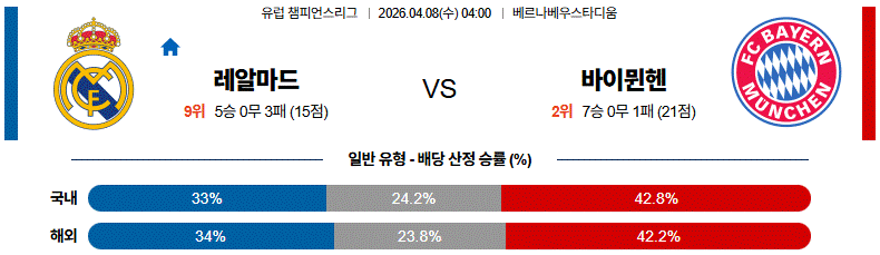 레알마드리드는 홈에서 안정적인 경기 운영과 효율적인 공격 전개를 통해 흐름을 조율하려 할 것이고, 바이에른 뮌헨은 강한 압박과 빠른 템포로 주도권을 잡으려 할 전망입니다.