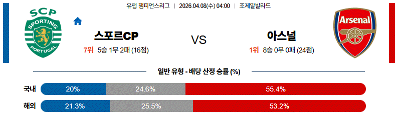 스포르팅CP는 홈에서 수비적으로 버티며 역습으로 변수를 만들 수 있지만, 전체적인 경기 주도권과 점유율 측면에서는 아스널이 한 단계 앞선 매치업입니다.