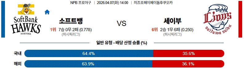 소프트뱅크 호크스는 오제키 토모히사(1승 1.50)가 시즌 2승 도전에 나선다. 31일 라쿠텐과 경기에서 6이닝 6안타 1실점의 투구로 승리를 거둔 오제키는 일단 작년 대비 3Km나 떨어진 구속으로도 잘 처리하는 모습을 보여주었다. 지난 시즌 세이부 상대로 1승 1패 2.25로 좋았던 투수라는 점도 기대 요소다. 일요일 경기에서 오지마 상대로 4점을 올린 소프트뱅크의 타선은 찬스가 왔을때 잡아내는 집중력이 놀라울 정도. 3안타 포함 주말 시리즈에서 대폭발한 이마미야 켄타는 그야말로 방망이로 시위중이다. 3이닝동안 1실점을 허용한 불펜은 마츠모토 유키의 WBC 후유증이 매우 심해 보인다.
