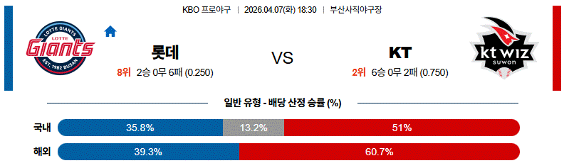 고영표는 첫 등판에서 공인구 문제를 어느 정도 드러낸바 있다. 이번 경기 역시 그 감각이 돌아올려면 조금 시간이 걸릴듯. 그러나 최근 불타고 있는 KT의 타격을 고려한다면 나균안 공략 역시 충분히 해볼만한 편이다. 이번 경기는 후반이 관건인데 롯데의 불펜은 그저 무너질뿐이다. KT의 승리를 본다.