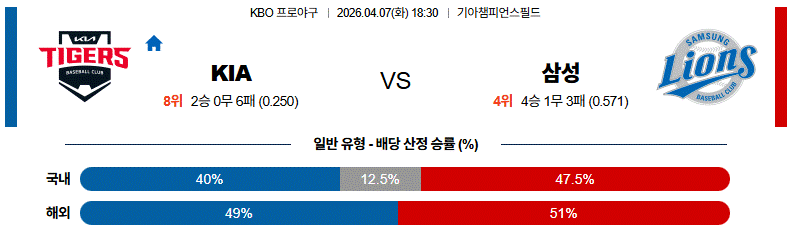 KIA가 연패를 끊어내긴 했지만 아직까지도 이 팀의 타선은 화력에 있어선 절대로 좋은 말을 해줄수 없는 레벨이다. 게다가 양창섭의 안정된 투구를 공략하는게 쉽지 않을듯. 결국 양현종이 어떻게든 버텨주는 투구를 해주는게 중요하지만 금년의 양현종은 작년의 양현종에 비해 훨씬 떨어지는 투수라는건 이미 증명되었고 삼성의 타선은 삼성의 타선은 한번 터지면 무섭게 터진다. 삼성이 승리를 가져갈 것이다.