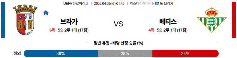 이번 경기 핵심은 브라가의 공격 템포와 베티스의 경기 조율 능력이며, 그 기준에서는 브라가가 흐름을 가져갈 가능성이 큽니다.