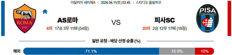 AS 로마는 홈에서 안정적인 경기 운영과 수비 집중력을 바탕으로 경기 흐름을 장악할 가능성이 높으며, 피사 SC는 수비적으로 버티는 시간이 길어질수록 부담이 커질 수 있습니다.