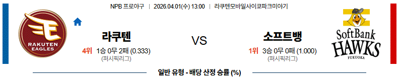라쿠텐은 홈 경기에서 변수를 만들려 할 가능성이 있지만, 전체적인 전력과 경기 운영에서는 소프트뱅크가 우위를 점하고 있습니다.