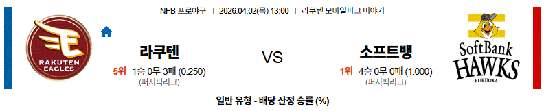 라쿠텐은 홈 경기에서 변수를 만들려 할 가능성이 있지만, 전체적인 전력과 경기 운영에서는 소프트뱅크가 우위를 점하고 있습니다.