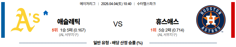 - 휴스턴이 초반부터 경기 주도권을 잡고, 애슬레틱스가 기동력으로 저항하는 구조가 예상됩니다. 다만 전체적인 공수 밸런스와 중심 타선 응집력은 원정팀이 더 나아 중후반 우세 가능성이 높습니다.