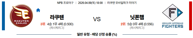 라쿠텐은 홈에서 수비적으로 버티며 접전을 만들 수 있지만, 전체적인 공격력과 경기 주도권에서는 닛폰햄이 한 단계 앞선 매치업입니다.