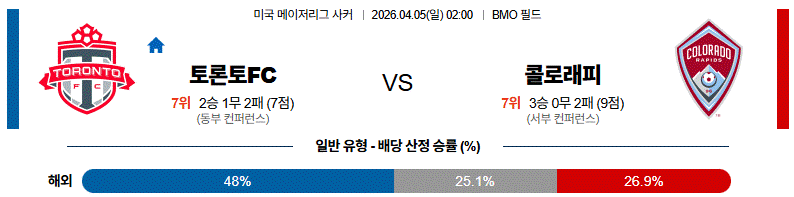 특히 토론토가 전방에서 무리하게 달려들기보다 중원 차단과 세컨볼 경쟁력으로 흐름을 잠그면, 콜로라도는 측면 우회나 단조로운 크로스 의존으로 밀릴 가능성이 있다.