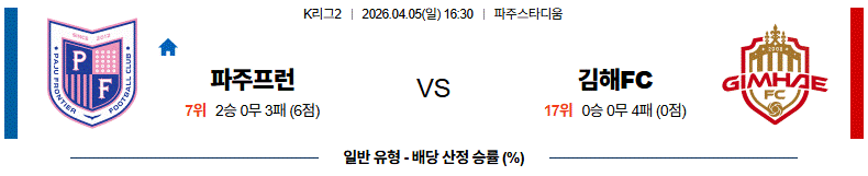 파주는 바우텔손을 향한 단순한 전방 연결 이후 세컨볼 경합으로 넘어갈 가능성이 높고, 김해는 이래준과 베카를 활용한 전개를 시도하더라도 마지막 한 칸이 쉽게 열리지 않을 수 있다.