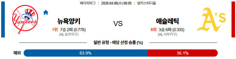 - 뉴욕Y가 중반 이전 한 번의 장타 구간으로 흐름을 잡을 가능성이 높습니다. 애슬레틱스가 일부 추격은 가능하겠지만 전체적인 득점 생산력 차이가 결과를 가를 수 있습니다.