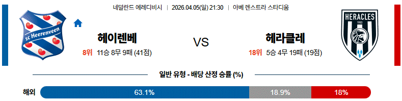헤이렌베는 홈에서 공격적인 운영을 통해 경기 흐름을 주도하려 할 가능성이 높고, 헤라클레는 수비 라인을 낮추며 실점을 최소화하는 데 집중할 전망입니다.
