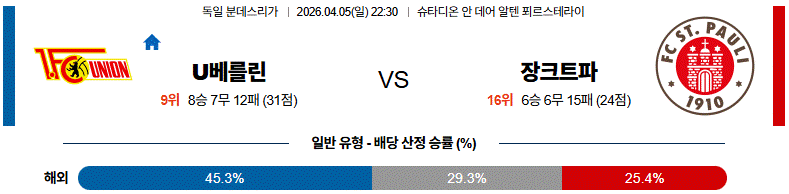 이번 분데스리가 경기 분석 기준에서는 U베를린이 실리적인 운영과 세트피스를 통해 승부를 가져갈 가능성이 높으며, 전체적으로는 다득점보다는 신중한 경기 흐름이 예상됩니다.