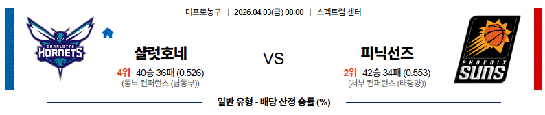 샬럿호네가 빠른 흐름을 유지하면 접전이 가능하지만, 전체적인 공격 완성도와 경기 운영에서는 피닉선즈가 한 단계 앞선 모습입니다.