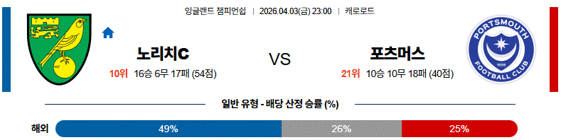 결국 이 경기는 노리치시티가 중원 압박과 전방 재탈취 완성도로 포츠머스의 전개를 무력화시키며 승리 흐름을 만들 가능성이 높다.