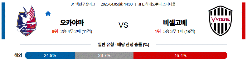 비셀고베는 중원에서의 템포 조절과 박스 안 침투 타이밍이 모두 살아 있는 팀이고, 오카야마는 반대로 측면 컷백 대응과 세컨드라인 침투 제어에서 버거운 흐름이 나올 수 있다.