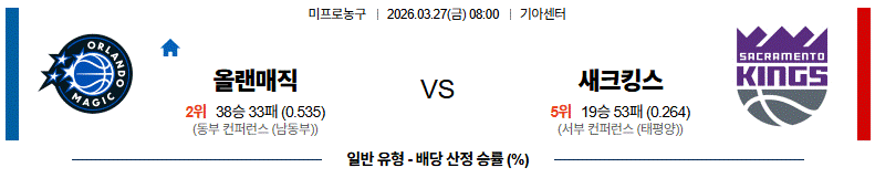 올랜도는 최근 6연패로 흐름이 꺾였지만 파올로 반케로를 중심으로 공격력 자체는 유지되고 있으며 홈 경기에서는 경쟁력을 보여주는 모습이다. 다만, 수비에서 높은 야투 허용률과 집중력 저하가 이어지며 경기 후반 흔들리는 장면이 반복되고 있다. 반면, 새크라멘토는 주축 선수들의 시즌 아웃 공백 속에 수비 조직력이 무너진 상태이며 리바운드와 외곽 수비 모두에서 열세를 보이고 있다. 전력 누수와 최근 흐름을 고려하면 올랜도가 경기 주도권을 잡을 가능성이 높고 홈 경기 이점을 바탕으로 올랜도 승리가 예상된다.