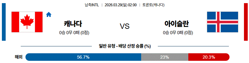 캐나다는 최근 무실점 흐름을 이어가며 안정적인 경기력을 보여주고 있고, 홈 경기에서도 강한 모습을 유지하고 있습니다. 반면 아이슬란드는 최근 경기력 기복이 크고 실점이 늘어나면서 수비 안정성이 떨어진 상태입니다.