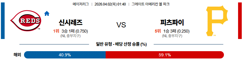 - 초반은 팽팽해도 중반 이후 신시내티 타선의 연속 출루와 주루 압박이 경기 방향을 바꿀 가능성이 높다. 피츠버그도 득점은 가능하지만 전체적인 안정감은 홈팀이 앞선다.
