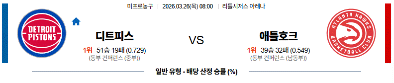 전체적인 공격 완성도와 득점력에서는 애틀호크가 앞서는 구조이며, 디트로이트는 수비에서 버텨내지 못할 경우 경기 흐름이 크게 흔들릴 수 있습니다.