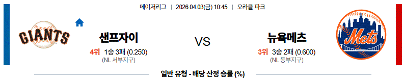 샌프자이는 선발이 버텨주는 흐름 속에서 중반 이후 기회를 살리려 할 가능성이 높고, 뉴욕메츠는 초반부터 적극적인 타격으로 경기 분위기를 먼저 가져가려 할 전망입니다.