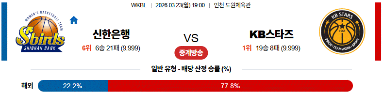 신한은행은 최근 경기에서 신지현을 중심으로 공격 전개는 나쁘지 않았지만 리바운드 열세와 수비 집중력 부족이 이어지며 흐름이 끊겼고 홈에서는 12연패와 1승12패로 극심한 부진이 지속되고 있다, 반면, KB스타즈는 최근 3연승 흐름 속에 허예은의 경기 운영과 박지수의 골밑 장악력이 안정적으로 이어지고 있으며 원정에서도 9연승 포함 11승2패로 강한 경쟁력을 유지하고 있다, 또한, 정규리그 우승 매직넘버 2를 남긴 상황에서 동기부여까지 확실한 만큼 KB스타즈의 승리가 예상된다.
