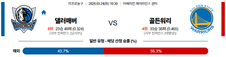 이번 경기는 댈러매버의 하프코트 중심 공격과 골든워리의 빠른 템포 농구가 맞붙는 형태로 전개될 가능성이 높습니다. 댈러스는 공격 효율을 앞세워 안정적인 득점 흐름을 만들려 할 것이고, 골든워리는 빠른 볼 흐름과 외곽슛으로 경기 속도를 끌어올리려 할 것입니다.