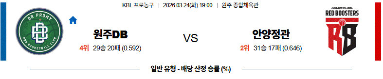 전체적으로 템포 싸움이 중요한 경기로, DB가 수비 리듬을 유지하면 저득점 흐름이, 정관장이 외곽이 터질 경우 다득점 흐름으로 바뀔 가능성이 있습니다.
