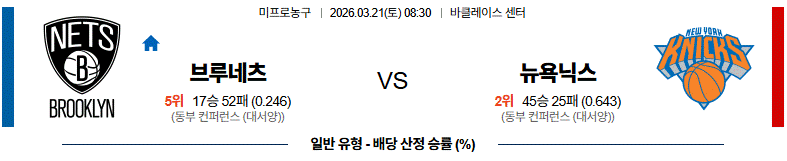 브루클린은 5연패 흐름 속에서 공격 효율이 크게 떨어지고 있고 경기 초반부터 흐름을 내주는 패턴이 반복되며 전반적인 경기 경쟁력이 낮아진 모습이다. 특히, 주득점원 이탈과 함께 야투 성공률 부진이 이어지며 득점 생산에서 어려움을 겪고 있다. 반면, 뉴욕은 4연승 흐름 속에서 공격과 수비 밸런스가 안정적으로 유지되고 있고 브런슨 결장 상황에서도 대체 자원들이 제 역할을 해주며 팀 완성도가 높아진 모습이다. 또한, 원정에서도 꾸준한 경기력을 이어가고 있으며 상대전에서도 압도적인 우위를 유지하고 있는 만큼 흐름에서 앞선다. 뉴욕 승리가 예상된다. 다만, 라이벌전의 특성을 감안한다면 핸디캡 범위는 과하다고 생각된다.