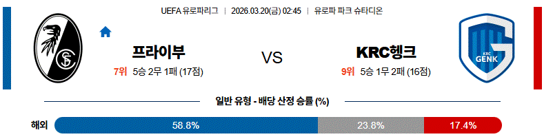 경기 흐름은 프라이부르크가 점유율을 가져가고 헹크가 역습으로 대응하는 형태가 예상되며 서로 찬스를 주고받는 양상이 될 가능성이 있습니다.