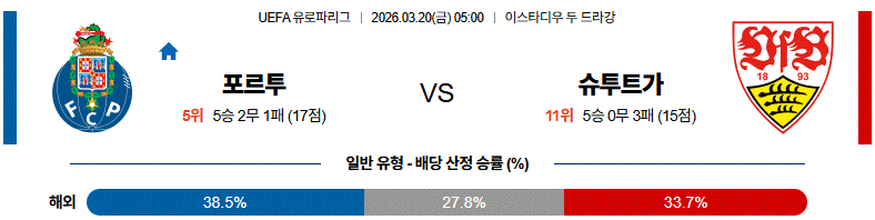 슈투트가르트는 전방 압박과 빠른 전환으로 초반 주도권을 잡으려 할 수 있지만, 포르투는 경험과 조직력을 바탕으로 흐름을 조절할 가능성이 있습니다.