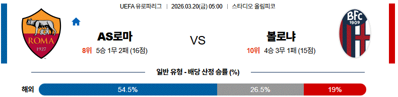 홈 경기 이점과 박스 안 마무리 완성도를 고려하면 AS로마가 조금 더 우세한 흐름을 만들 수 있는 경기입니다.