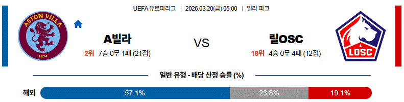 릴OSC가 쉽게 무너지지는 않겠지만 전체적인 경기 흐름에서는 애스턴빌라가 조금 더 주도권을 잡을 가능성이 있는 매치업입니다.