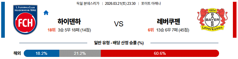 하이덴하임은 수비적으로 버티며 역습을 노리겠지만 수비 조직력 문제로 인해 압박을 견디기 쉽지 않은 상황입니다.