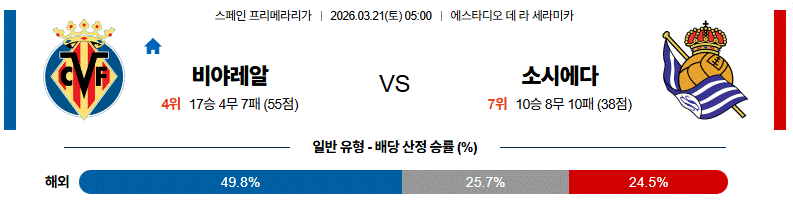 비야레알은 홈에서 공격적으로 주도권을 잡으려 할 가능성이 높고, 레알소시는 안정적인 수비를 바탕으로 대응할 전망입니다.