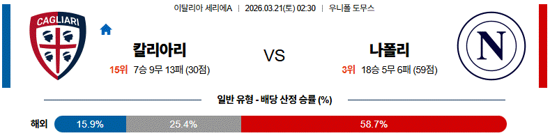 양 팀 상대 전적에서는 나폴리가 압도적인 우위를 기록하고 있으며 최근 맞대결에서도 큰 점수 차 승리를 거둔 바 있습니다. 경기 흐름은 나폴리가 점유율과 공격을 주도하고 칼리아리가 수비적으로 대응하는 구조가 예상됩니다.